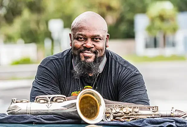 “Jeremy Carter is a true study of Jazz music, Nebraska native, and understudy of the Southeast’s best professors and musicians. Jazzy funk riffs, screaming over the sounds of the BSP is truly a spectacle, for the ears and the eyes. If you find yourself stop dancing in a dropped draw fashion, it is probably because of Carter’s riffs, his soul pouring over the speakers like sand. Carter has recorded with numerous national acts and has performed, recorded and produced solo albums and cameo appearances too many too list.”